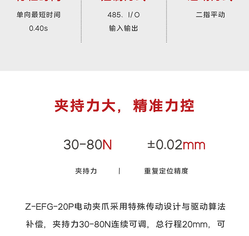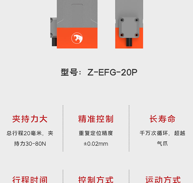 慧灵HITBOT,电动夹爪Z-EFG-20P,是一款精准力控,采用特殊传动与驱动算法补偿,夹持力30-80N连续可调,总行程20mm,重复定位精度±0.02mm,二指平动单向行程运动时间仅0.40秒,可以满足狭小空间,高速稳定的夹持需求!